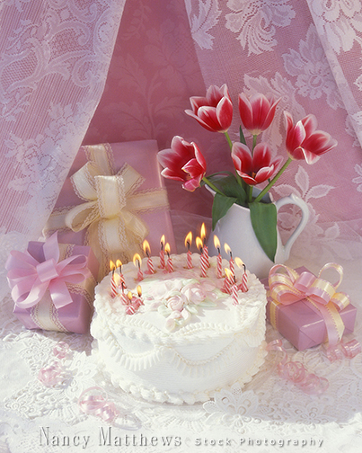 Description: birthday cake with candles and tulips