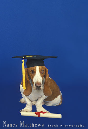 Description: basset hound with diploma and mortarboard