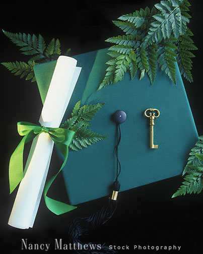 Description: diploma and mortarboard with a key
