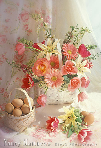 Description: spring basket of flowers with eggs