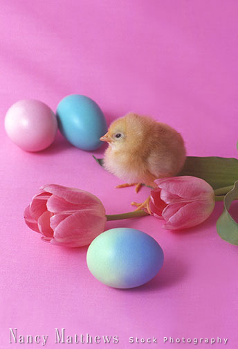 Description: chick with pink tulips and eggs