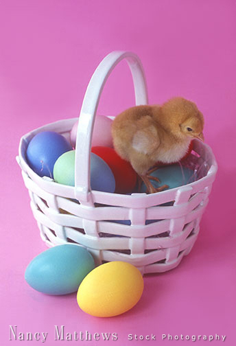 Description: chick in a basket with eggs