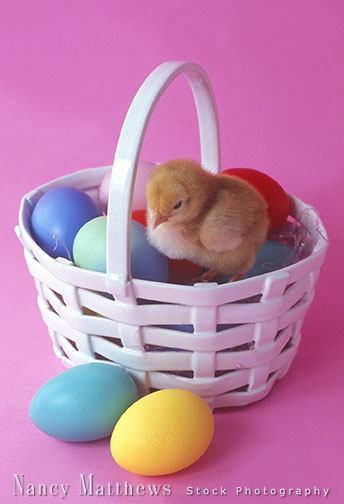 Description: chick in a basket with eggs