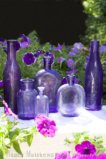 Description: purple bottles in a garden