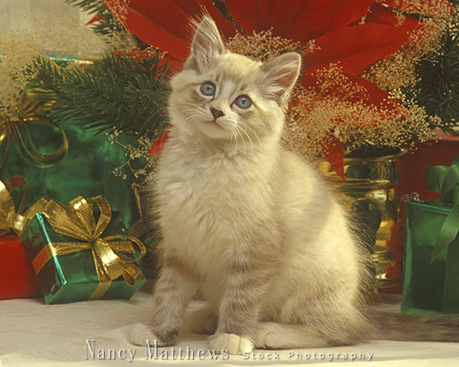 Description: kitten with packages and a poinsettia