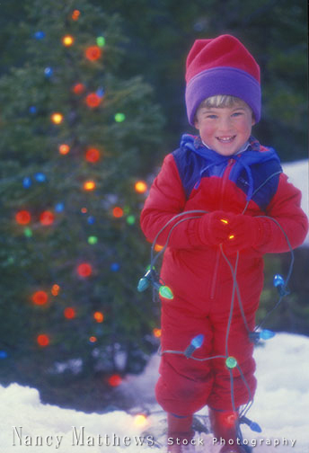 Description: little boy tangled up in christmas lights