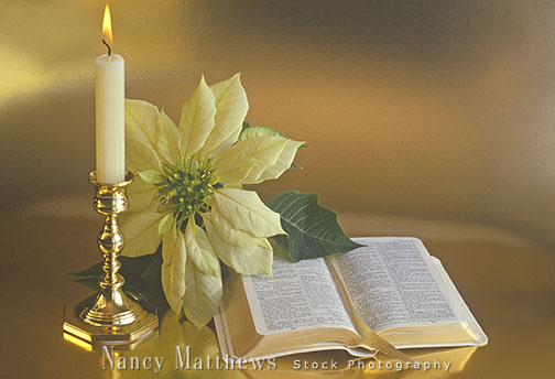 Description: bible with a candle and poinsettia