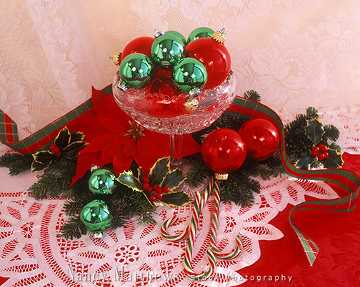 Description: bowl of ornaments with candy canes and a poinsettia