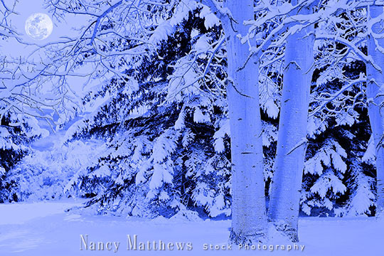 Description: aspen grove in winter in moonlight
