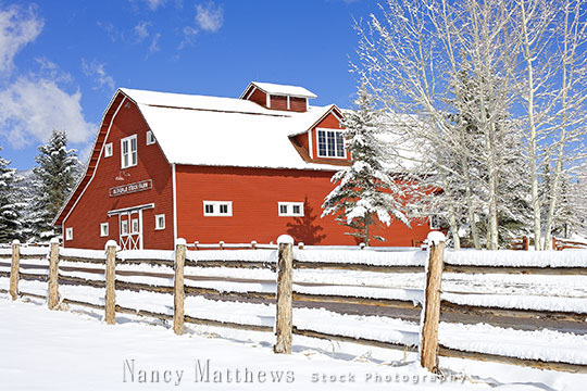 Description: red barn in snow
