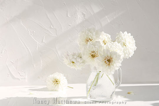 Description: white dahlias in a pitcher