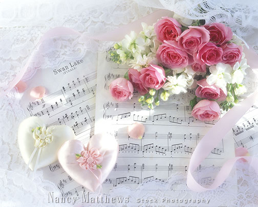 Description: sheet music with hearts and pink roses