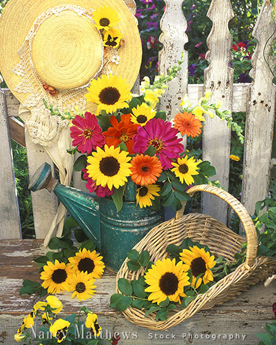 Description: floral with a garden hat and basket near a picket fence