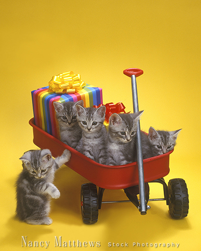 Description: kittens in wagon with birthday packages