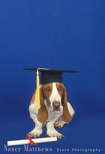 Description: basset hound with diploma and mortarboard