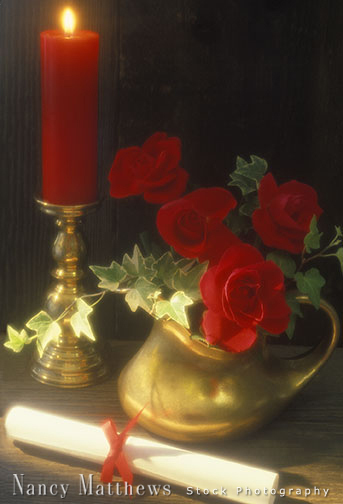 Description: red roses with a candle and diploma