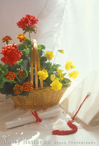 Description: diploma and mortarboard with a basket of flowers