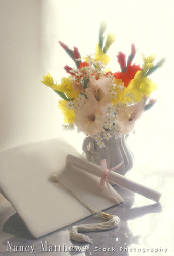 Description: mortarboard and diploma with flowers