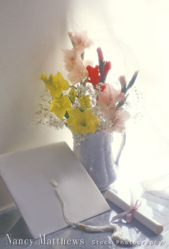 Description: mortarboard and diploma with flowers