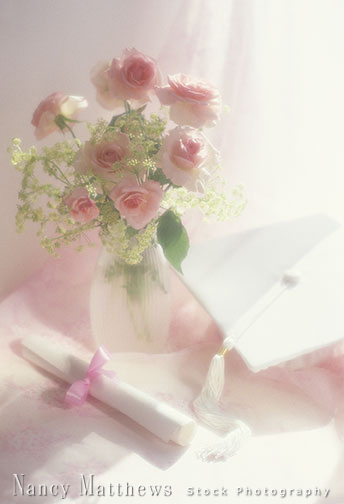 Description: diploma and mortarboard with pink roses