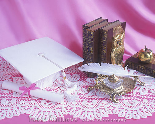 Description: diploma and mortarboard with desk items
