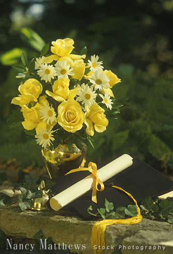 Description: diploma and mortarboard with yellow roses and daisies