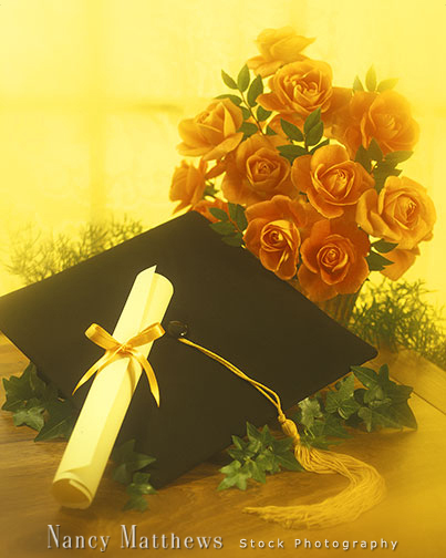 Description: diploma and mortarboard with roses