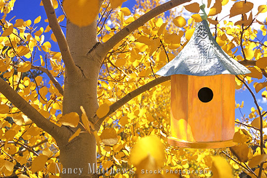 Description: golden aspen tree with a birdhouse