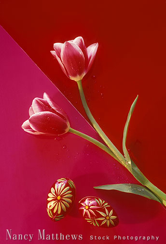 Description: pink tulips with painted eggs