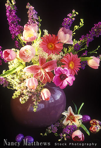 Description: vase of flowers with eggs