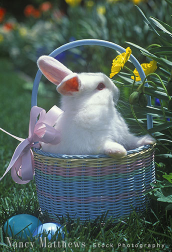 Description: easter basket and bunny in a garden