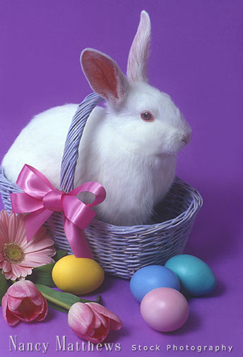 Description: bunny in a basket with eggs and flowers