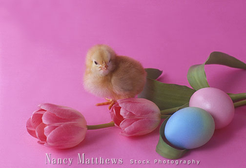 Description: chick with two pink tulips and eggs