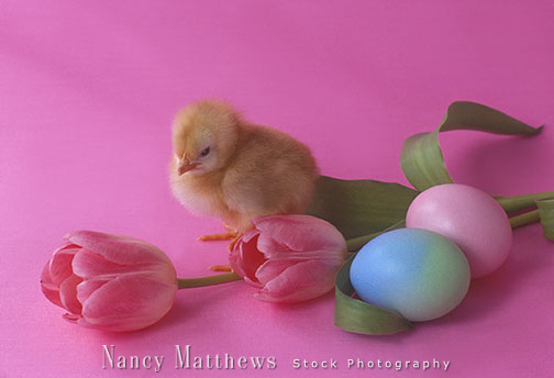 Description: chick with two pink tulips and eggs