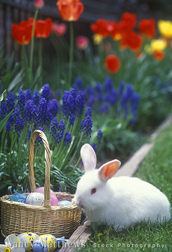 Description: easter basket and bunny in a spring garden