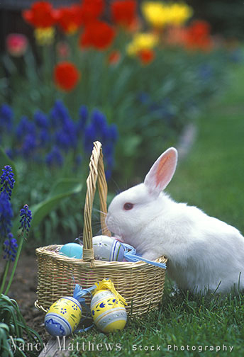 Description: easter basket and bunny in a spring garden