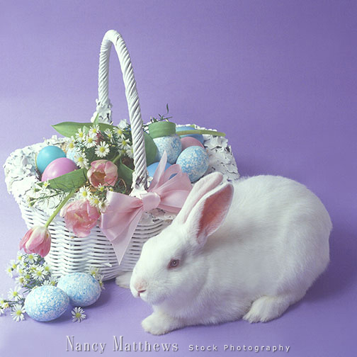 Description: white bunny with a basket of eggs
