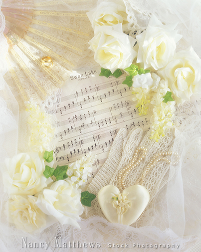 Description: sheet music, fan and white roses