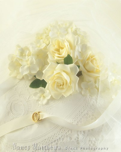 Description: white roses and wedding rings