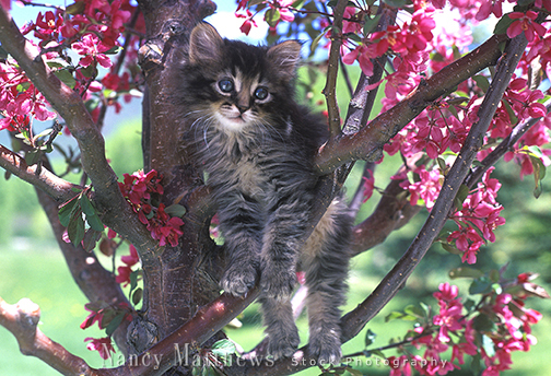 Description: grey tabby kitten in flowering tree