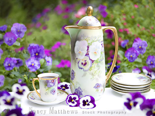 Description: teapot in a pansy garden with a coffee cup