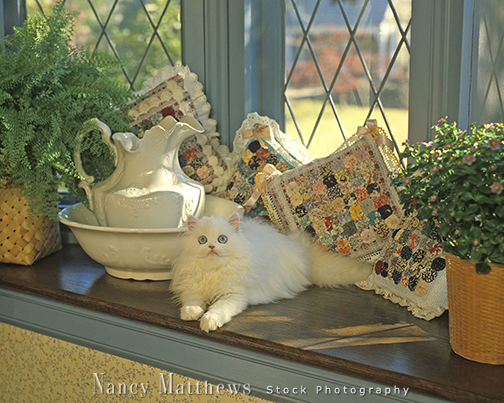 Description: white persian in a window seat