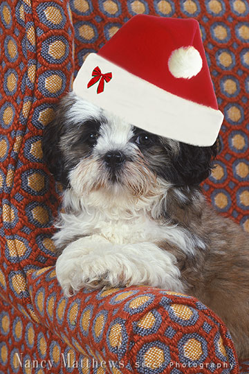 Description: cockapoo puppy in a chair at christmas
