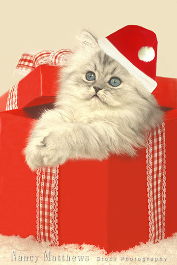 Description: persian kitten in a red box at christmas
