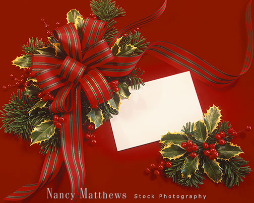 Description: plaid bow with a card and holly