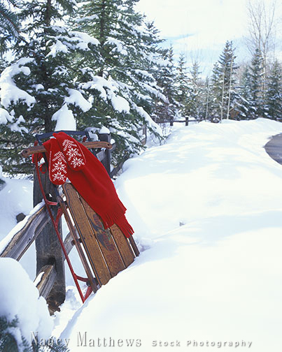 Description: sled with mittens and scarf by snowy lane