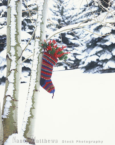 Description: christmas stocking in an aspen tree