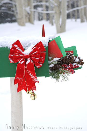 Description: snowy green mailbox at christmas