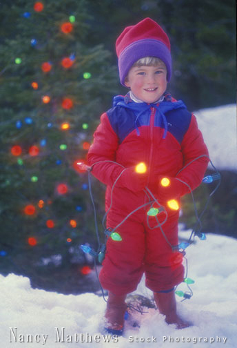Description: little boy tangled up in christmas lights