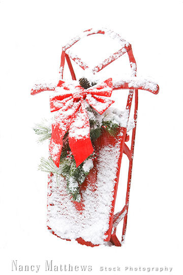 Description: red sled in a snowstorm